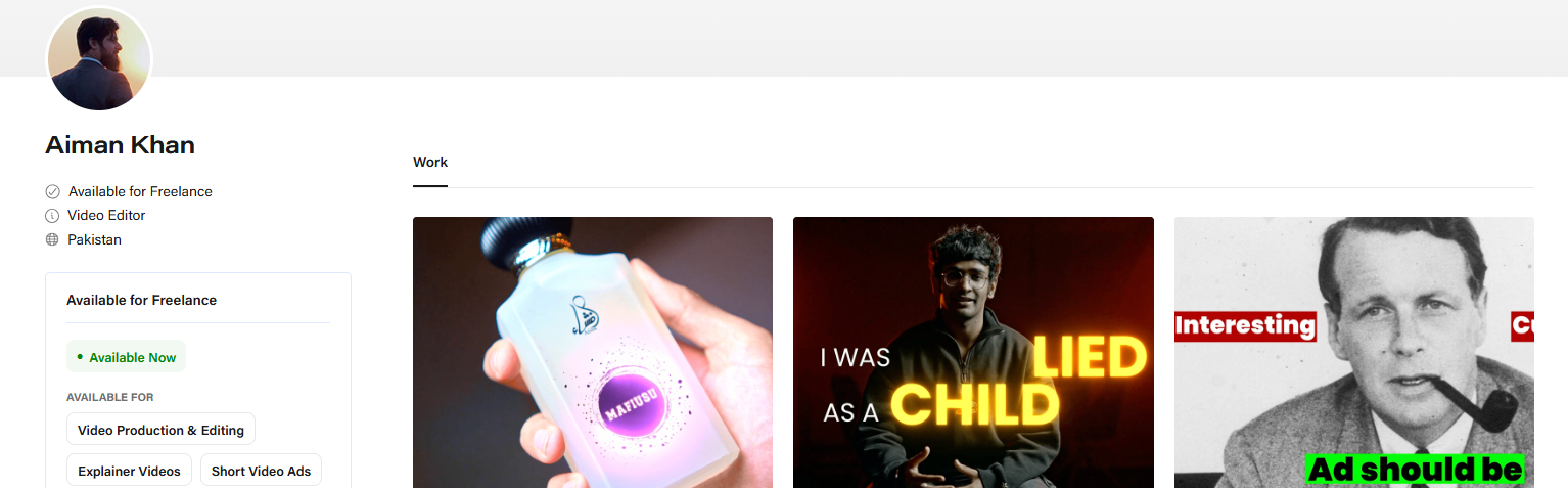 My name is Aiman Khan, a passionate video editor dedicated to showcasing my skills and creativity. From video editing to color adjustment and motion graphics, I adeptly handle a variety of projects that bring stories to life.